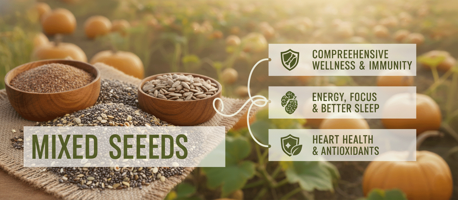 This all in one mix supports heart health, digestion, skin glow, and immunity, making it a wholesome choice for daily nutrition. Whether you’re fueling your day, topping your smoothie bowl, or adding crunch to your meals, mixed seeds make eating healthy easy and enjoyable.